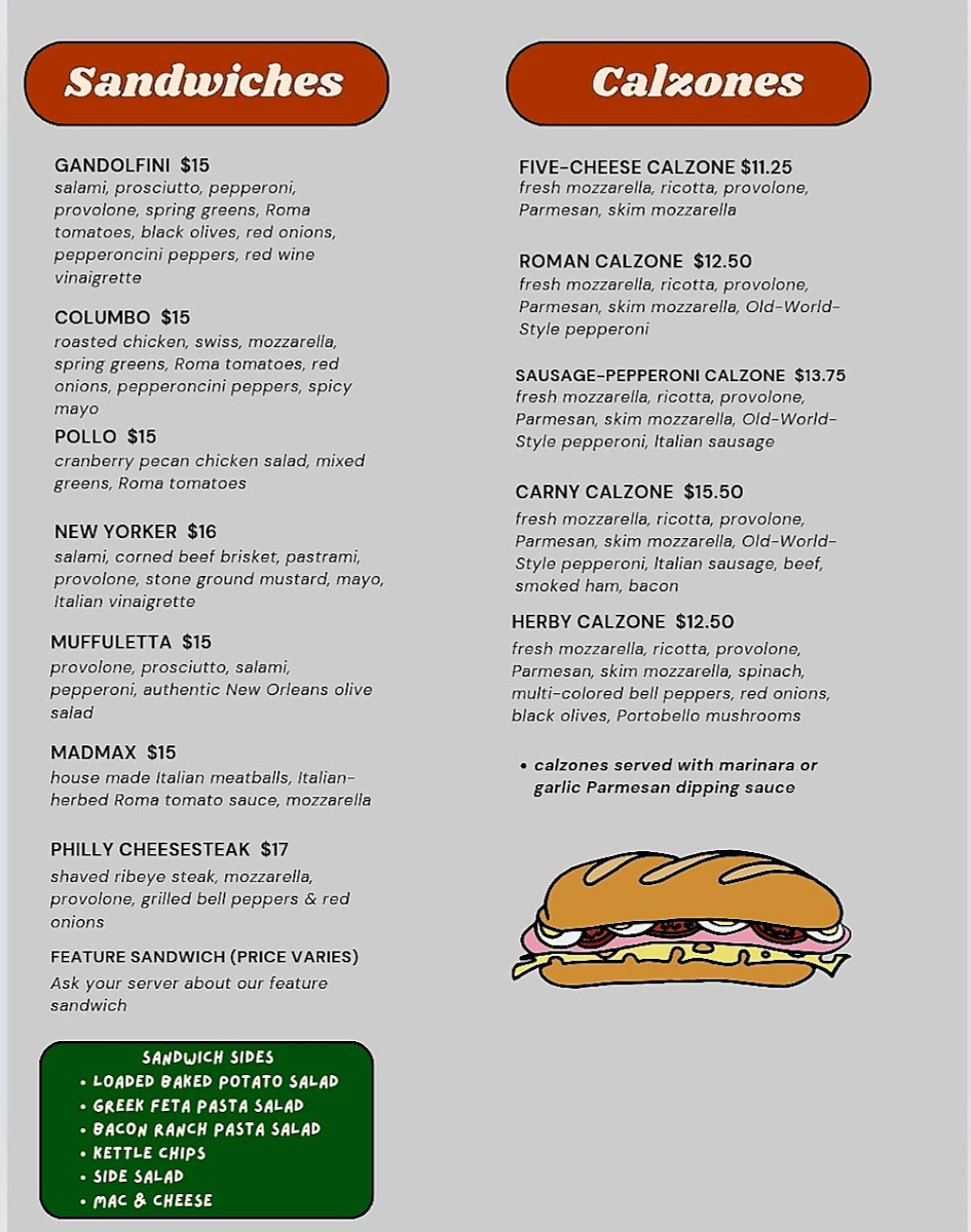 When it comes to mains, the pasta dishes stand out-Spaghetti & Italian Meatballs and Spinach Alfredo Fettuccine & Chicken Ricotta Meatballs offer hearty Italian classics, while the Just For Kids menu includes fun and easy options like Make-Your-Own Pizza and Fettuccine. Sandwich lovers will enjoy the flavorful Gandolfini or Pollo New Yorker, while pizza enthusiasts can indulge in specialty pies such as the Five Cheese or Roman pizza. The calzones, including the cheesy Five-Cheese Calzone and savory Sausage-Pepperoni Calzone, provide another great choice for those seeking something a bit different.