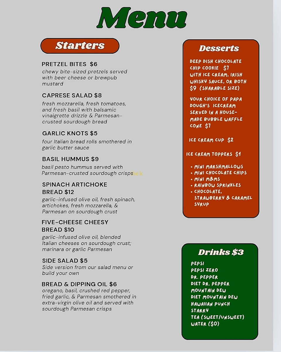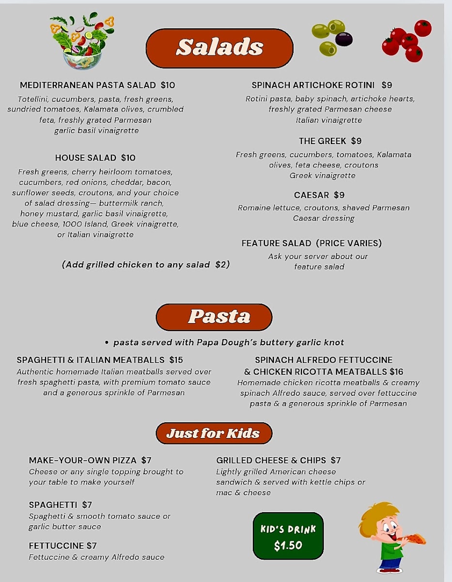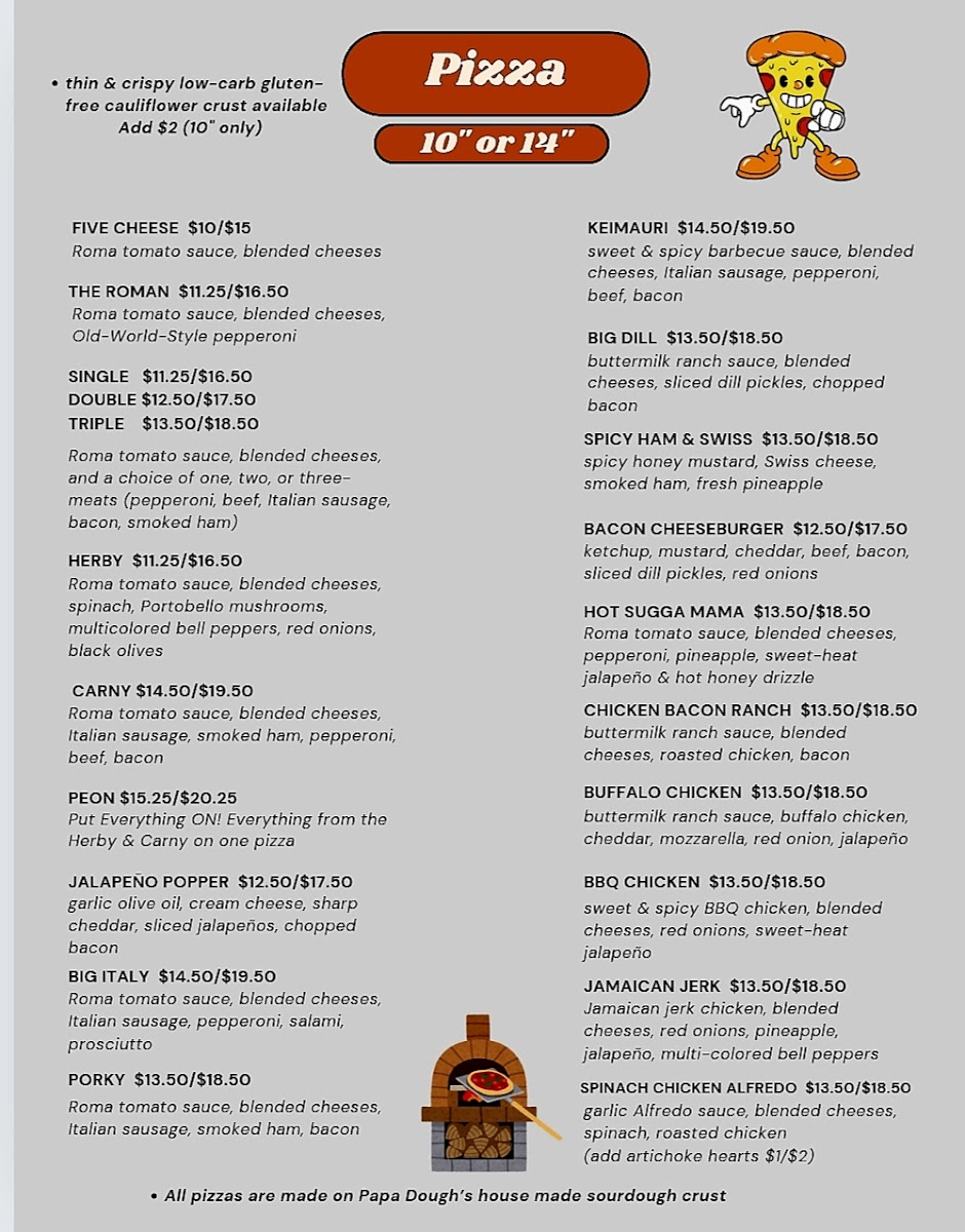 Papa Dough's Bay City Tavern offers a diverse menu catering to a wide range of tastes, making it a great spot for both casual dining and indulging in hearty meals. Start your meal with delicious Pretzel Bites, Caprese Salad, or Garlic Knots, which set the tone for the flavorful offerings to come. For those craving comfort, try the Spinach Artichoke Bread or Basil Hummus for a creamy, savory treat. The selection of Salads includes fresh options like Mediterranean Pasta Salad and Caesar, alongside indulgent choices such as the Spinach Artichoke Rotini.